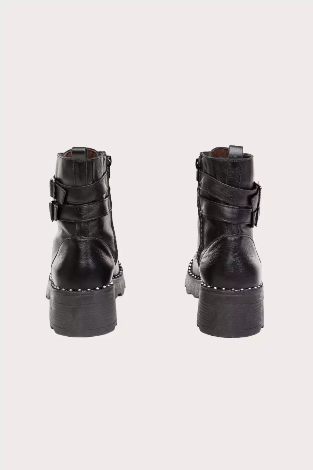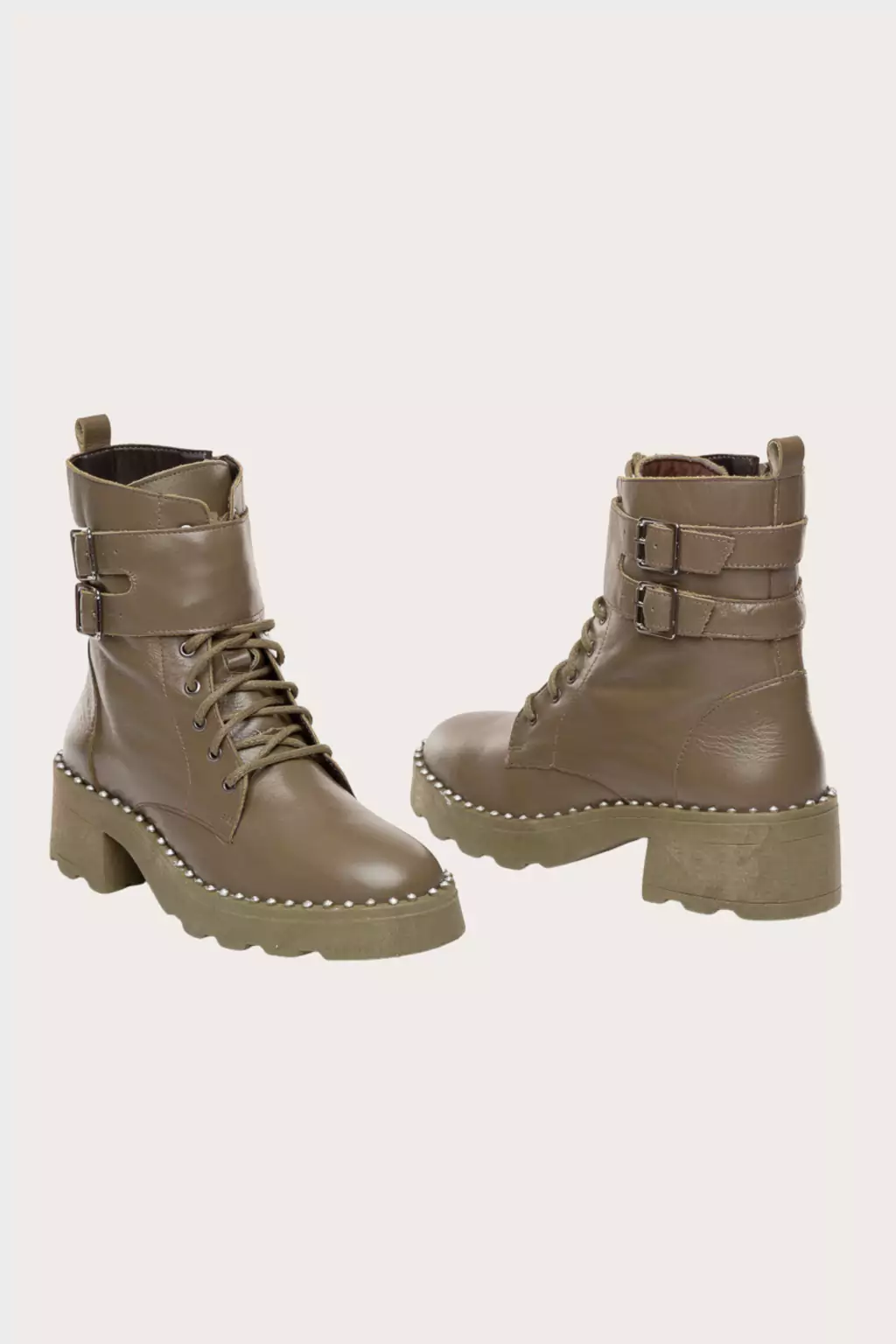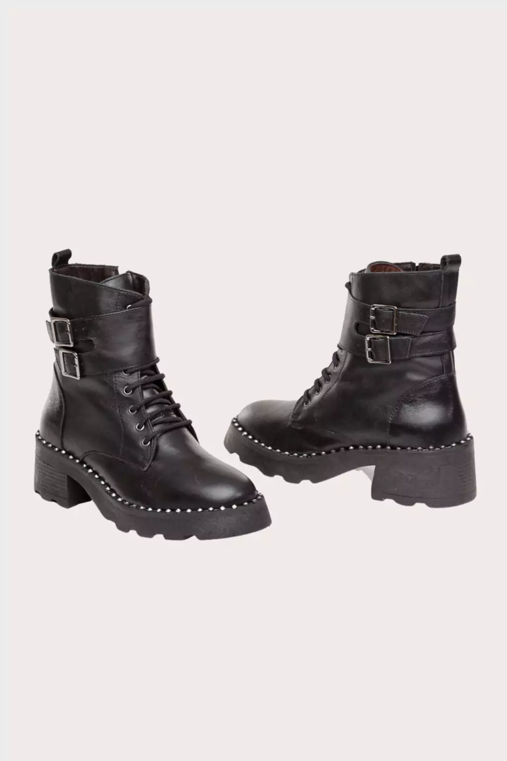 A bota Dara possui duas fivelas prateadas nas laterais, que oferecem maior estabilidade e ajuste na canela, além de serem um detalhe elegante e moderno. Seus detalhes estilo spikes em volta da borda do solado adicionam um toque de estilo e atitude à bota, tornando-a uma opção ideal para quem procura um calçado resistente e moderno.
