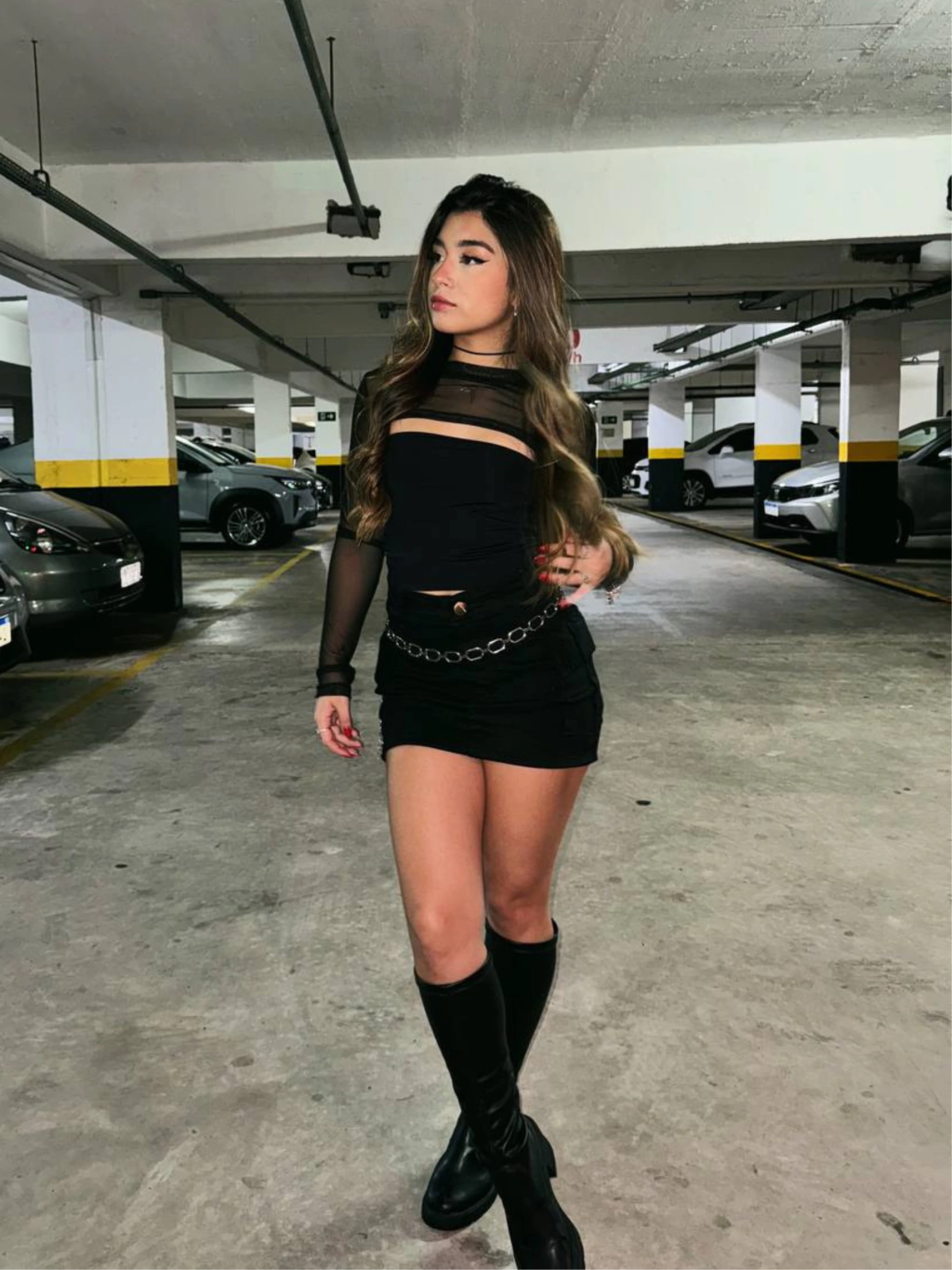 O top tube é confeccionado em suplex, um tecido maleável que modela a silhueta com maestria, garantindo um caimento perfeito e confortável. O destaque do look é a sobreposição em tule, que adiciona um toque de elegância e modernidade, tornando-o único.
