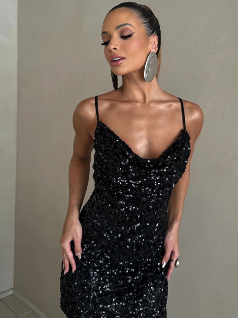 Confeccionado em paetê de alta qualidade, o vestido destaca-se pelo brilho incrível e pelo caimento impecável, que valoriza cada curva do corpo feminino. Ele foi feito para transformar qualquer momento em uma experiência inesquecível, com um toque de elegância e sensualidade que exala confiança.